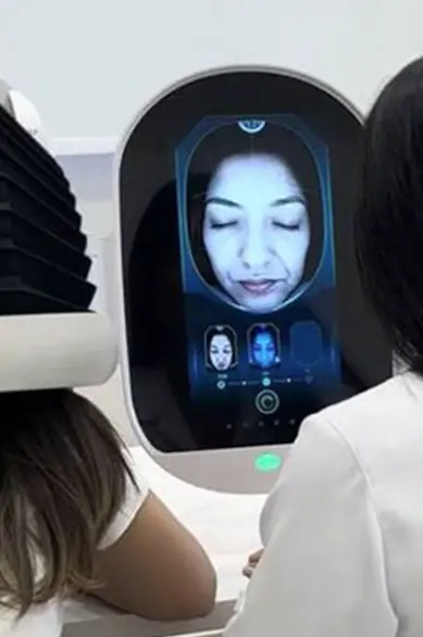 Ele faz uma análise qualitativa e quantitativa da sua pele, examinando: rugas, poros, textura, hidratação, oleosidade e manchas e combinada com Inteligência Artificial estima a idade da sua pele.