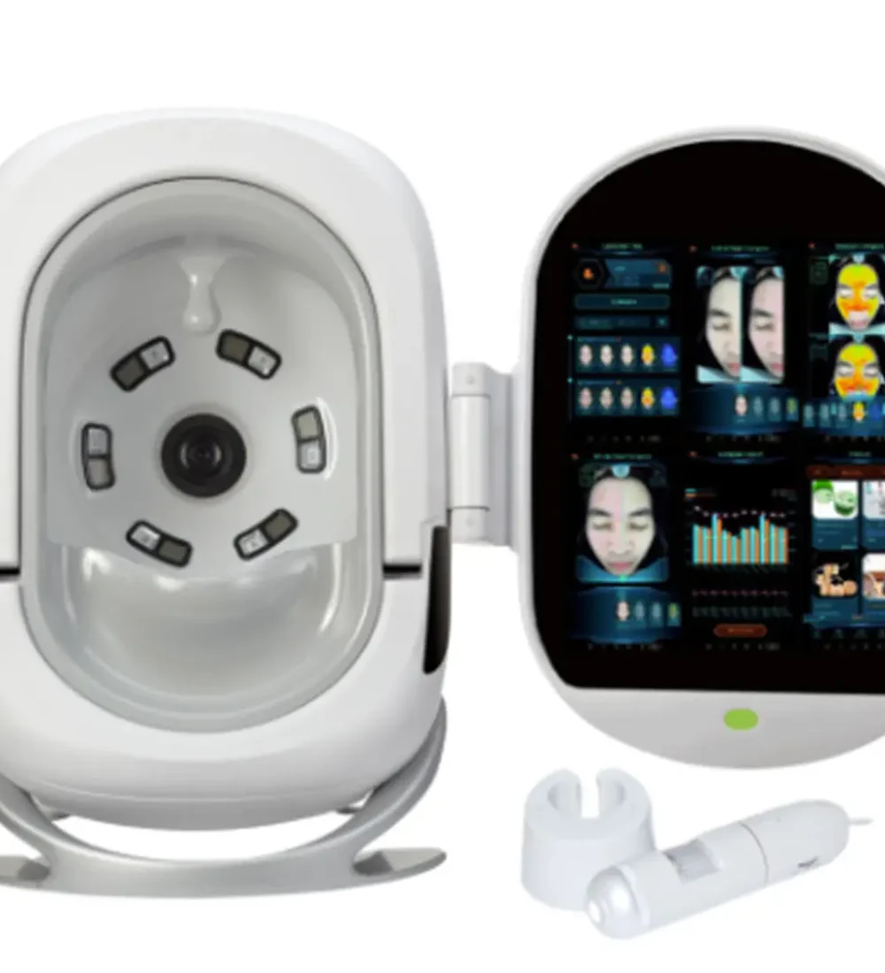 Ele faz uma análise qualitativa e quantitativa da sua pele, examinando: rugas, poros, textura, hidratação, oleosidade e manchas e combinada com Inteligência Artificial estima a idade da sua pele.